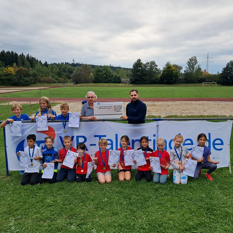 Der Leichtathletikkreis Rottweil führte im Zeitraum von Mai bis September an vier Terminen die VR-Talentiade Kinderliga durch. Aus sieben Kreisvereinen trafen sich rund 170 Kinder mit 39 Mannschaften zum Finale bei der TG Schwenningen im Waldeckstadion. Unter den Augen zahlreicher Zuschauer absolvierten die Kinder im Alter von 6 bis 11 Jahren an verschiedenen Stationen einen 30 Meter fliegend Sprint, Weitsprung über ein Hindernis, 6 mal 50 Meter Staffel, Drehwurf mit Tennisring und Biathlon. In der Altersklasse der U12 siegte der TV Sulz 2 mit 595 Punkten vor SV Mariazell 3 mit 546 Punkten und der SG Deißlingen 1 mit 523 Punkten. Bei den U10 ging der erste Platz an die TG Schwenningen 1 mit 552 Punkten, dicht gefolgt von der SG Schramberg 4 mit 542 Punkten und dem TV Dietingen 1 mit 531 Punkten. In der jüngsten Altersklasse der U8 belegten die ersten beiden Plätze die SG Deißlingen 1 mit 591 Punkten vor der SG Schramberg 1 mit 580 Punkten, der dritte Platz ging an die TG Schwenningen 1 mit 548 Punkten. Die Siegerehrung wurde von dem Vorsitzenden des Leichtathletikkreis Rottweil Norbert Burkhardt zusammen mit dem Filialleiter der Volksbank Schwenningen, Herrn Helmut Hotz durchgeführt. Alle Kinder konnten eine Urkunde und Medaillen der Volksbanken und Raiffeisenbanken in Empfang nehmen. Für die Siegermannschaften gab es zusätzlich Pokale. Herr Hotz überreichte abschließend noch einen Spendenscheck in Höhe von 250,00 Euro an den Ehrenvorsitzenden Dieter Franke des Leichtathletikkreis Rottweil.