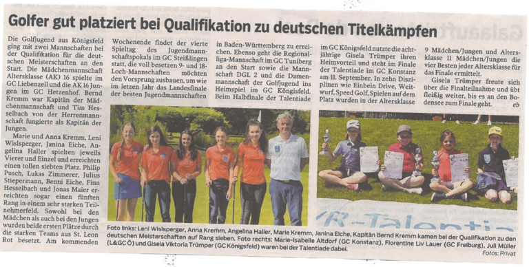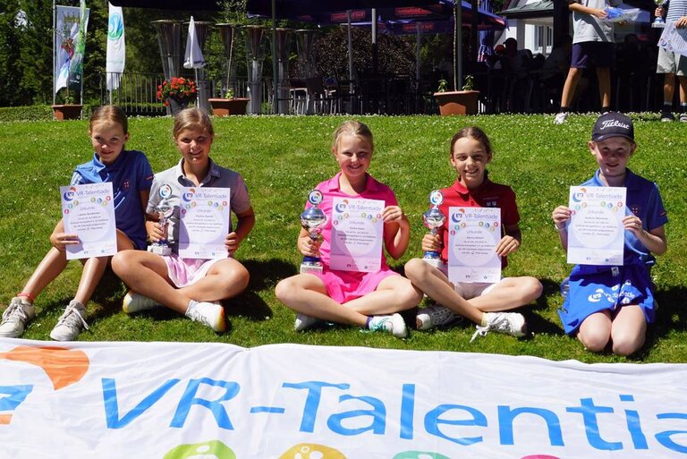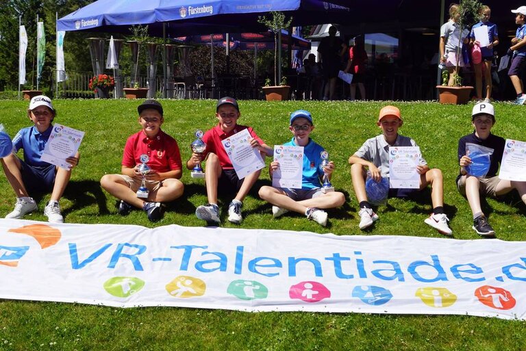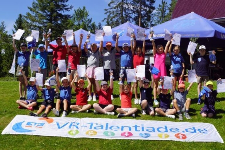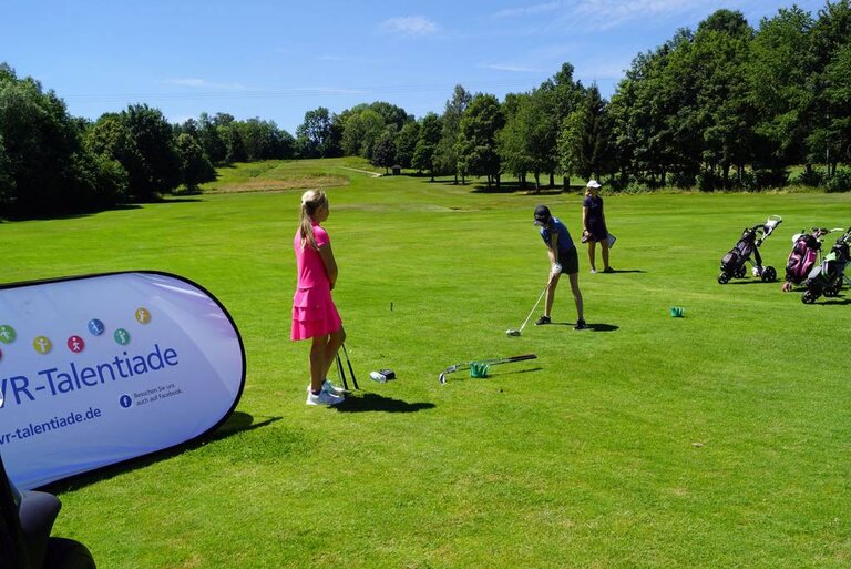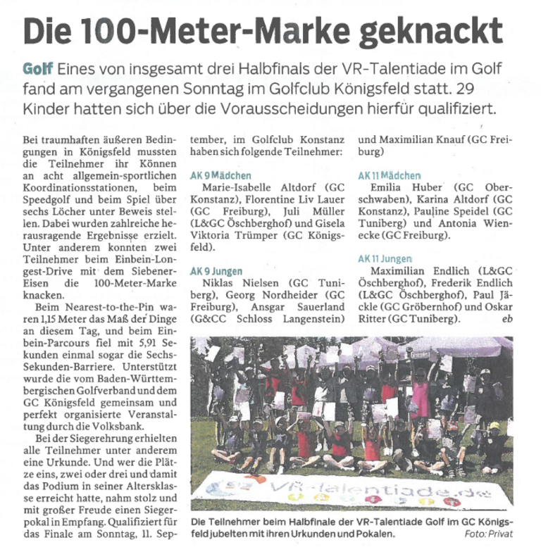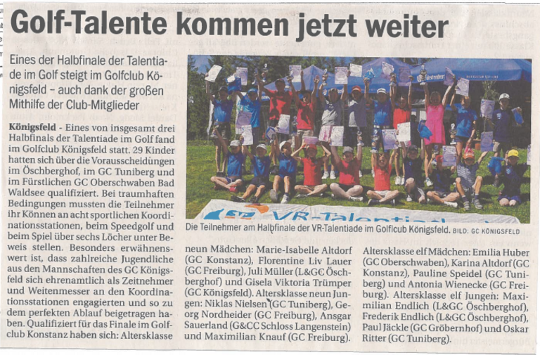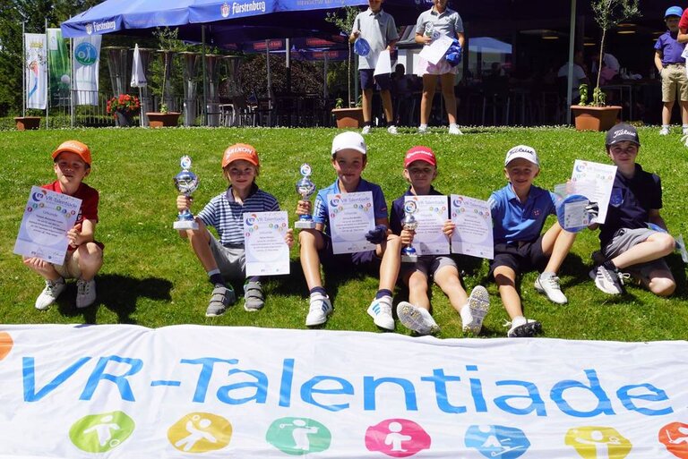 Das dritte Halbfinale der VR-Talentiade Golf fand am Sonntag, 03. Juli 2022 im Golfclub Königsfeld statt. Dort trafen sich die besten Drei der Altersklassen Mädchen AK 9 / AK11 und Jungen AK 9 / AK11 aus den Qualifikationsturnieren der Gruppen 7 bis 9 Ende Mai im L&GC Öschberghof, im GC Tuniberg und im Fürstlichen GC Oberschwaben Bad Waldsee. Von 29 Qualifizierten insgesamt hatten 23 für dieses Halbfinale gemeldet. Durch zwei kurzfristige Absagen waren schließlich 21 Kinder aus acht BWGV-Mitgliederclubs am Start. Das größte Kontigent stellte der Freiburger Golfclub mit sechs Kindern, je drei waren von den Golfclubs Konstanz, Königsfeld, Tuniberg und Öschberghof am Start und jeweils eines vom GC Gröbernhof, vom GC Schloss Langenstein und vom Fürstlichen GC Oberschwaben. Unterstützt wurde die Veranstaltung durch die „Volksbank Königsfeld“, die in der Region als "Volksbank – Die Gestalterbank" firmiert und ihren Sitz in Offenburg hat. Ein ganz herzliches Dankeschön an die Verantwortlichen der Bank, welche die Jugendarbeit des gastgebenden Golfclubs aus Anlass der Austragung dieses VR Talentiade-Halbfinales im Golf mit einer Spende unterstützten. Bei traumhaften äußeren Bedingungen in Königsfeld hieß BWGV-Spielleiter Rainer Gehring die Kinder und ihre Eltern um 09.15 Uhr zusammen mit Helga Huber vom GC Königsfeld und seinem Kollegen Manfred Grobs auf der Clubhausterrasse willkommen. Nachdem der organisatorische Ablauf bekannt gegeben war, führten die acht erwachsenen Flightbegleiter die ihnen zugeteilten Kinder zu den Koordinationsstationen, die am Vormittag ab 09:45 Uhr auf dem Kurzplatz und auf der 9. Spielbahn absolviert wurden. Zahlreiche herausragende Ergebnisse wurden erzielt. Unter anderem konnten zwei Teilnehmer beim Einbein-Longest-Drive mit dem 7er-Eisen die 100 Meter Marke knacken. Beim Nearest-to-the-Pin waren 1,15 Meter das Maß der Dinge an diesem Vormittag und beim Einbein-Parcours fiel mit sensationellen 5,91 Sekunden einmal sogar die 6 Sekunden Barriere. Ab 11.15 kehrten die Flightgruppen zur Zwischenverpflegung zum Clubhaus zurück, um sich dort für das bevorstehende Spiel über 6 Löcher (Spielbahnen 1,2,3,6,7,8) sowie für das „Speedgolfen“ auf der Spielbahn 5 zu stärken. Um Punkt 12 Uhr wurde mit einem Kanonenstart dann bereits der Nachmittagsdurchgang eröffnet. Den Kindern bereitete das Spiel über die zwischen 150 und 200 Metern langen Spielbahnen sichtlich Spaß. Und wer sie beim Speedgolf auf der Bahn 5 abschlagen und dann dem Ball hinterherflitzen sah, der war schon vom Zuschauen begeistert von den Leistungen, welche die Kinder bei den ganz schön heißen Nachmittagstemperaturen zu zeigen imstande waren. Auf die Rückkehrer von der 6-Loch Runde wartete im Clubhaus, dem Ristorante&Pizzeria Bellaviste, ab 14.00 Uhr ein exzellentes Nudelbuffet. Ein herzliches Dankeschön an die beiden Inhaber Carmine Galasso und Francesco Danieli mit ihrem Team einerseits für das tolle Essen und andererseits für die so herzliche Gastfreundlichkeit und den perfekten Service, den alle an diesem Tag erleben und genießen durften! Eine 1 mit ***! Die gebührt auch den Eltern, die als Flightbegleiter fungierten sowie allen in die Organisation involvierten Personen des GC Königsfeld: der Sportwartin des Vereins Golfjugend Königsfeld Helga Huber, dessen 1. Vorsitzenden Stefan Brintzinger und Schatzmeister David Dominguez sowie Clubmanager und Fotograf Andreas Blessing. Und ebenso allen Stationsbetreuern des Clubs – bemerkenswert, dass es in so großer Zahl Jugendliche des Clubs im Alter von 15 bis 18 Jahren waren - die sich an diesem heißen Sonn(en)tag engagiert haben! Da Clubmanager Andreas Blessing in kürzester Zeit die Auswertungslisten erstellt hatte, konnte ohne Wartezeit nach dem Buffet die Siegerehrung durchgeführt werden. Alle TeilnehmerInnen erhielten eine Platzierungs-Urkunde sowie als Präsent des GENO-Verbandes einen „Fitness-Slider“. Die 12 für das Finale Qualifizierten durften sich zusätzlich über ein VR-Talentiade T-Shirt freuen. Und wer die Plätze eins, zwei oder drei und damit das Podium in seiner Altersklasse erreicht hatte, nahm stolz und mit großer Freude auch noch einen Pokal in Empfang! Qualifiziert für das Finale am Sonntag, den 11. September 2022 im Golfclub Konstanz sind: AK 9 Mädchen Marie-Isabelle Altdorf (GC Konstanz), Florentine Liv Lauer (GC Freiburg), Juli Müller (L&GC Öschberghof) und Gisela Viktoria Trümper (GC Königsfeld) AK 9 Jungen Niklas Nielsen (GC Tuniberg), Georg Nordheider (GC Freiburg), Ansgar Sauerland (G&CC Schloss Langenstein) und Maximilian Knauf (GC Freiburg) AK 11 Mädchen Emilia Huber (GC Oberschwaben), Karina Altdorf (GC Konstanz), Pauline Speidel (GC Tuniberg) und Antonia Wienecke (GC Freiburg) AK 11 Jungen Maximilian Endlich (L&GC Öschberghof), Frederik Endlich (L&GC Öschberghof), Paul Jäckle (GC Gröbernhof) und Oskar Ritter (GC Tuniberg) Abschließend, mit einem Klick, zur Ergebnisübersicht!