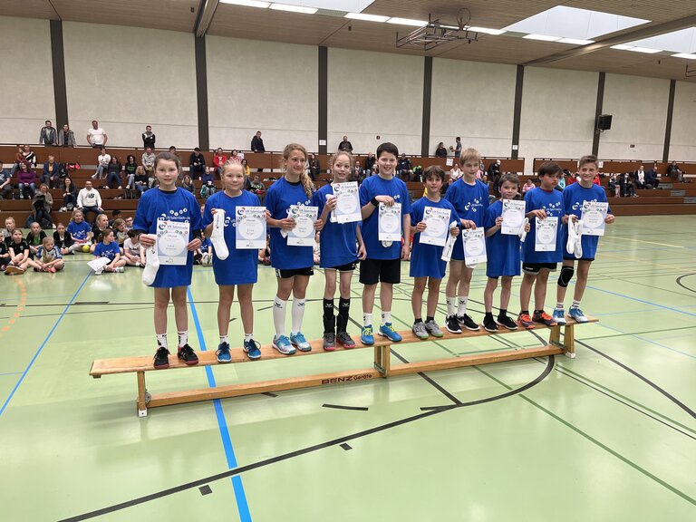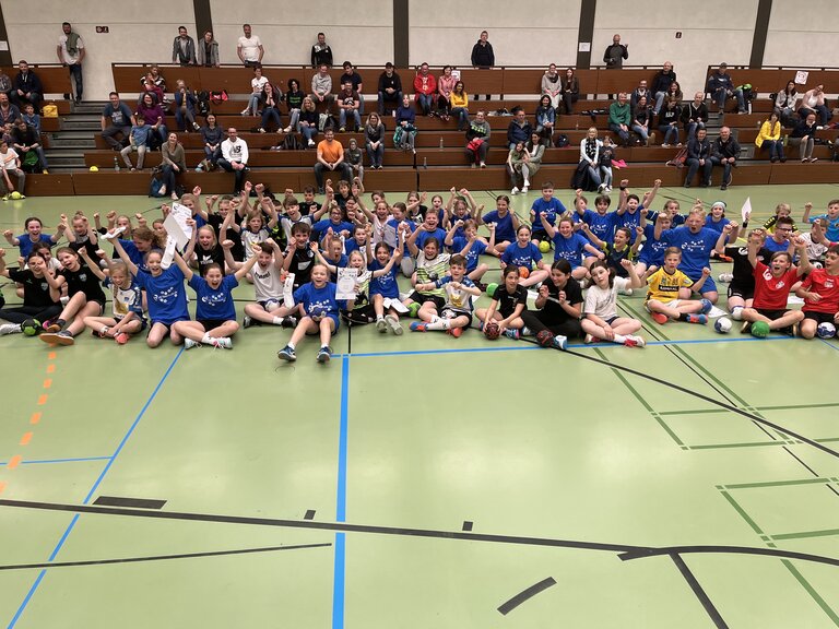 VR Talentiade Bezirksentscheid bei der HSG Bad Wimpfen /Biberach Am Samstag den 30.04. ging es früh los in der heimischen Stauferhalle, den der Bezirksentscheid der VR-Talentiade war zu Gast. Früh morgens begann der Aufbau der acht Koordinationsstation. In den Koordinationen konnten die aus dem Bezirk gesichteten 80 Talente ihr koordinatives Können unter Beweis stellen. Wurfstärkenmessung, Prellen durch einen Reifenparcour oder auch schnelle Sprünge auf Zeit war für viele der Jungs und Mädels kein Problem und jeder meistere die Übungen mit Pravour. Nachdem der Vormittag dann rum war, ging es darum sich schnell bei der Bewirtung zu stärken und neue Energie für den Nachmittag zu sammeln, den dann standen die Handballspiel-Sichtungen an. Mit Wienern, belegten Brötchen und auch Kuchenspenden unserer Damen, bei denen wir uns nochmal herzlich bedanken wollen, war hier für jeden etwas dabei um sich zu stärken und die Akkus waren nach der Mittagspause bei allen wieder aufgeladen. Am Nachmittag ging es dann los acht Spielpaarungen waren angesetzt, damit jedes Kind die Möglichkeit hat dem Bezirk sein können aufzuzeigen und somit später für die Auswahl zur Verbandstalentiade gesichtet zu werden. Alle Kids gaben hier Vollgas den natürlich wollte jeder bei der Auswahl des Bezirks dabei sein. Nach circa drei Stunden war den Mitarbeitern des Bezirks auch klar, dass unser Bezirk Heilbronn Franken eine tolle Auswahl an Spielern und Spielerinnen aufweisen kann und dies die Aufgabe der Auswahl der fünf Besten nicht einfacher macht. Trotzdem mussten die Mitarbeiter des Bezirks hier eine Auswahl treffen, welche dann bei der Siegerehrung den Spielern mitgeteilt wurde. Die Begeisterung war groß bei den ausgwählten Spielerinnen und Spielern. Aber auch alle anderen Teilnehmer konnten stolz auf sich sein, denn sie wurden als 80 Beste Talente im Bezirk Heilbronn Franken gesichtet und hatten auch ihr Können unter Beweis gestellt. Mit Emma, Mia, Fabi, Lennox und Rojiat konnte auch die HSG Bad Wimpfen / Biberach fünf Teilnehmer zum Bezirksentscheid entsenden. Auch wenn es für euch nicht zum Verbandsentscheid weiter ging, sind wir als Verein absolut stolz auf die Leistung die ihr gezeigt habt. Wir möchten uns auch nochmal bei allen Helfern und Unterstützern bedanken, ohne die ein solches Event nicht möglich gewesen wäre.