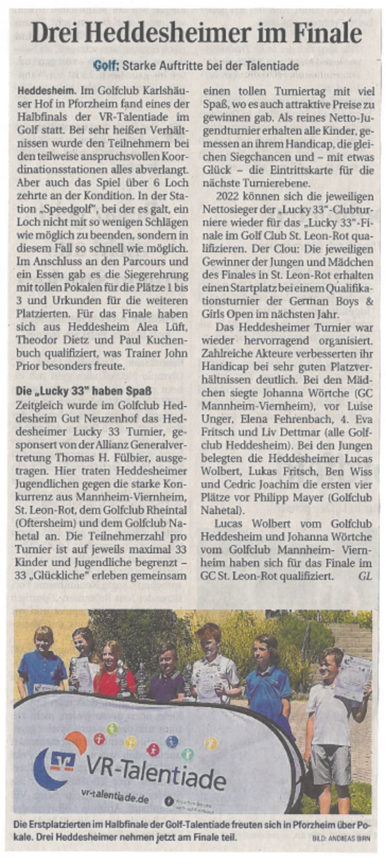 Am Samstag, 02. Juli 2022 fand eines der drei Halbfinals der VR-Talentiade Golf statt. Ausgetragen wurde es im Karlshäuser Hof Golf Pforzheim in Nordbaden. Nach den drei Qualifikationsturnieren in den Golfclubs Heidelberg-Lobenfeld, Bad Liebenzell und Bruchsal standen 35 Teilnehmer und Teilnehmerinnen für das Halbfinale fest. Das Wetter spielte hervorragend mit und so konnte der Ablauf wie geplant stattfinden. Nach der Begrüßung um 09:00 Uhr starteten die Jungs mit dem Spiel über 6 Loch und die Mädchen bei den Stationen. Das Spiel über 6-Löcher wurde auf den Bahnen 10, 11, 13, 14, 15 & 16 durchgeführt und die Station Einbein Longest Drive wurde ebenfalls auf der Bahn 16 absolviert. Die restlichen Koordinationsstationen fanden auf den Bahnen 17 & 18 sowie im Warm-Up Bereich und auf dem Putting Grün statt. Nach circa 1 1/ 2 Stunden waren die Ersten schon wieder am Clubhaus und konnten sich mit einer kleinen Rundenverpflegung, die von den fleißigen Helferinnen und Helfern des Karlshäuser Hofs selbst gebacken wurde, stärken. Um 12:15 Uhr wechselten dann die Mädchen zum Spiel über die 6-Löcher und den Einbein Longest Drive und die Jungs absolvierten die Koordinationsstationen. Andrea Grabherr (Karlshäuser Hof Golf Pforzheim), hatte jede Menge Helferinnen und Helfer für die Stationen im Einsatz. Sie war ebenfalls den ganzen Tag auf dem Platz unterwegs, um nach dem rechten zu schauen. Nachdem die Kids alle Stationen und Löcher durchlaufen hatten, gab es noch ein leckeres Pasta-Teller Gericht sowie ein kühles Getränk im Ristorante Calabria. Währenddessen wurden die Sieger und Siegerinnen ermittelt und die Siegerehrung konnte beginnen. Andrea Grabherr und Constanze Tochtermann (BWGV) begrüßten alle Anwesenden und nahmen im Anschluss die Siegerehrung der Kids vor. Alle Teilnehmer und Teilnehmerinnen erhielten eine Urkunde und einen Fitness Slider vom GENO-Verband. Die Platzierten auf den Plätzen 1-3 erhielten zusätzlich noch einen Pokal und alle die sich für das Finale qualifiziert haben (Plätze 1-4), erhielten noch ein blaues VR-Talentiade Shirt. Constanze Tochtermann bedankte sich stellvertretend bei Andrea Grabherr für die super Organisation der VR-Talentiade, bei den zahlreichen Gruppenbegleiterinnen und Gruppenbegleitern sowie den Stationsbetreuerinnen und -betreuern, ohne die diese Veranstaltung nicht durchgeführt werden könnte. Qualifiziert für das Finale am Sonntag, 11. September 2022 im Golfclub Konstanz haben sich: AK 9: Mädchen: Carla Sauerland (GC St. Leon-Rot), Amelie Siegrist (GC St. Leon-Rot), Lotte Hustert (GC St. Leon-Rot), Emilia Gloss (Karlshäuser Hof Golf Pforzheim). Jungen: Daniel Pasch (GC Bad Liebenzell), Paul Berger (GC Heidelberg-Lobenfeld), Paul Kuchenbuch (GC Heddesheim Gut Neuzenhof), Felix Ollhoff (Stuttgarter GC Solitude). AK 11: Mädchen: Marie Peters (GC St. Leon-Rot), Noa Marlen Blum (GC St. Leon-Rot), Paula Reinhard (GC Bad Liebenzell), Alea Lüft (GC Heddesheim Gut Neuzenhof). Jungen: Sam Scheffler (Stuttgarter GC Solitude), Theodor Dietz (GC Heddesheim Gut Neuzenhof), Samuel de Vries (Baden Hills G&CC), Levin Hildt (GC St. Leon-Rot). Zu den Ergebnissen bitte hier klicken.