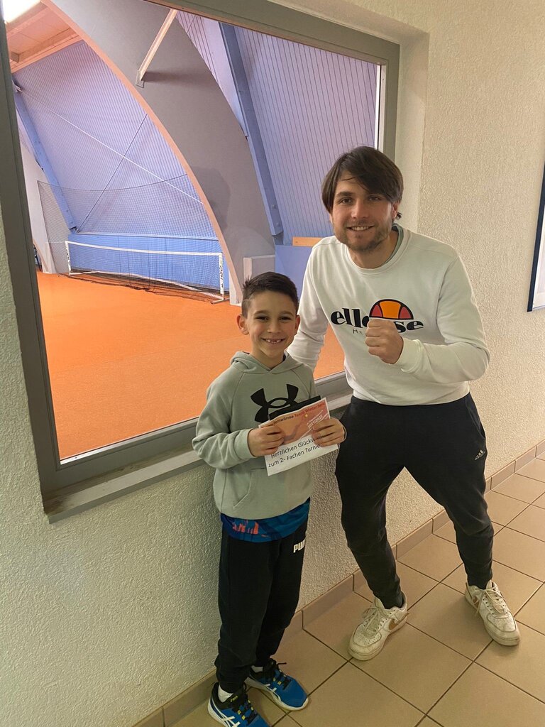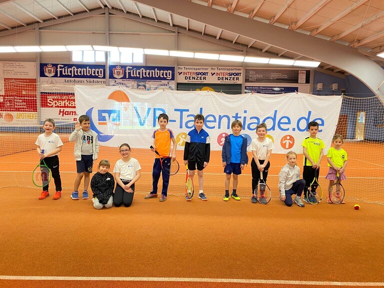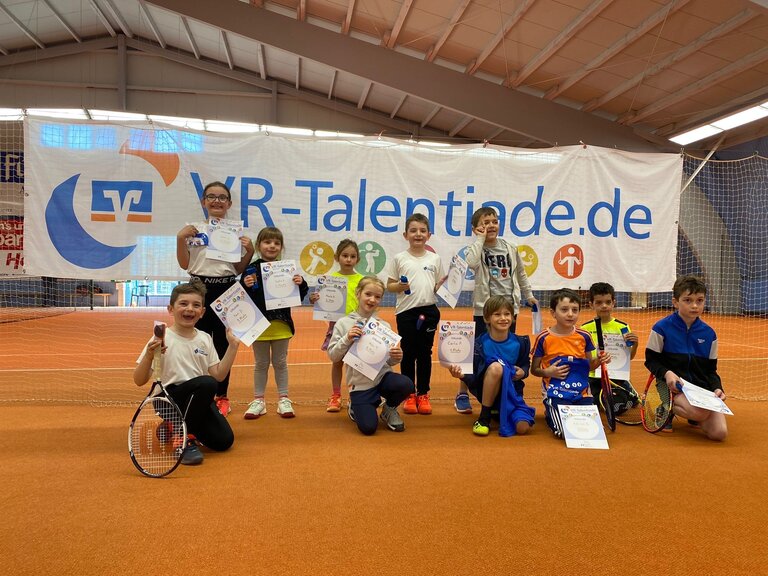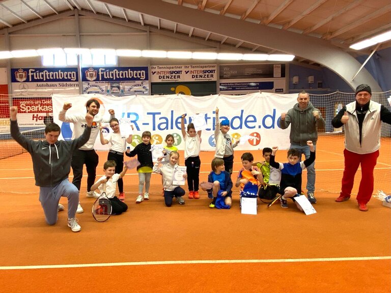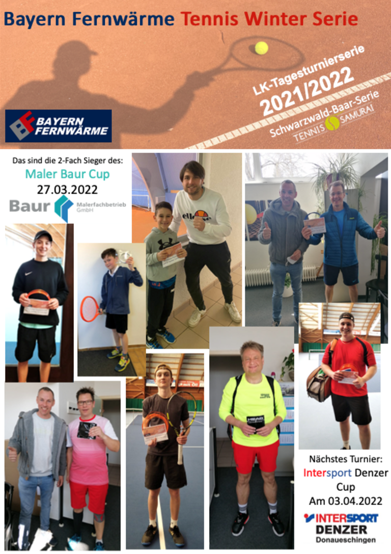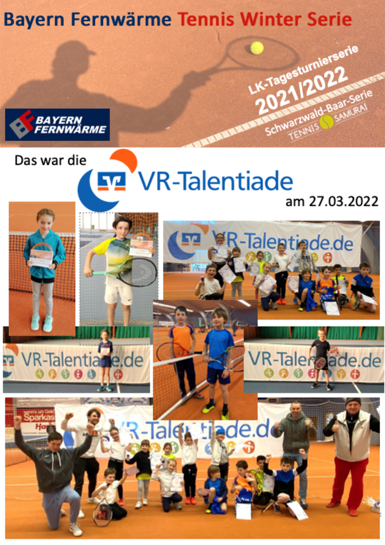 Am 27.03.22 fand der sechste Spieltag der VR Talentiade unserer jungen nachwuchs Talente in der Halle des TC BW Donaueschingen statt. Zeitgleich wurde bei dem Maler Baur Cup um LK Punkte, ein spannendes und schön anzuschauendes Tennis gespielt. Es wurde wieder, von jung bis alt, mit vollem Einsatz der Schläger geschwungen. In der U 9 Kleinfeld Kategorie konnte sich Carlo Preter vom Tennisclub Tengen bei einem spannenden Spiel, mit viel Können und Ehrgeiz den ersten Platz sichern. Der zweite Platz ging knapp an Andrian Ettwein vom TC Blau-Weiß Donaueschingen. Bei dem U 10 Midcourt Turnier gab es gleich mehrere Zweifach-Sieger, diese waren: Claudia Spalcke vom TC BW Vaihingen-Rohr, Leon Warthmann vom Turn- u. Sportverein Steißlingen e.V., Ben Eisele vom TC Ehingen/Donau und Nele Teubert vom TC Blau-Weiß Donaueschingen. Die Spiele waren spannend und ließen das Publikum mitfiebern. Die Jungen Talente beweisen sich jedes Mal aufs Neue. Nicht zu vergessen ist die U 10 Großfeld Kategorie. Die Kinder spielten ein spannendes Tennis, die Zuschauer waren nicht zu bremsen. Levent Cinar gewann gegen die beiden Brüder Julian und Jonas Riens haushoch. Julian und Jonas ließen sich nicht beirren und spielten auf Augenhöhe um Platz 2 und 3. Julian gewann jedoch und holte sich somit den zweiten Platz. Doch auch Jonas kann stolz auf sich sein und hat sich den dritten Platz mehr als verdient.