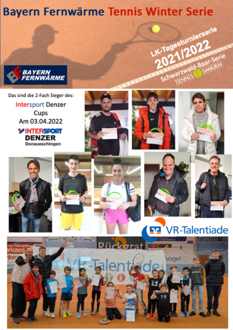 Am 03.04.22 fand der siebte und somit der letzte Spieltag der VR Talentiade unserer jungen nachwuchs Talente in der Halle des TC BW Donaueschingen statt. Zeitgleich wurde bei dem Intersport Denzer Cup um LK Punkte, ein spannendes und schön anzuschauendes Tennis gespielt. Es wurde wieder, von jung bis alt, mit vollem Einsatz der Schläger geschwungen. Es war ein schöner Abschluss dieser Turnierserie! Die letzte VR Talentiade dieser Turnierserie war kleiner als die letzten, dennoch musste bei dem Können der Kinder keine Abstriche gemacht werden. Wie auch bei dem vorherigen Turnier holte sich Carlo Preter vom Tennisclub Tengen den ersten Platz. Wir gratulieren ihm und bedanken uns bei allen Kindern für die Teilnahme!